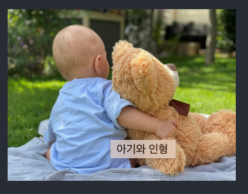위 이미지는 title 속성에 "아기와 인형"이라는 텍스트를 적용한 것이다. 마우스 커서를 가져다 대면 해당 텍스트가 말풍선으로 보여진다.