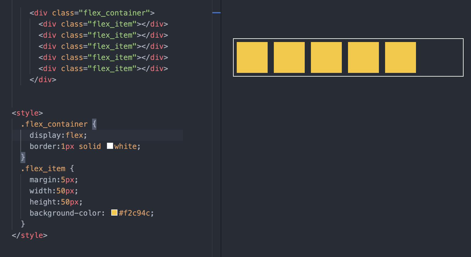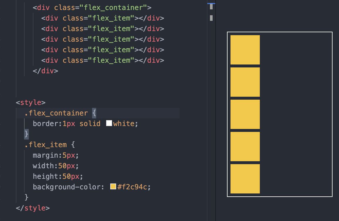flex container에 display:flex; 속성을 적용하자 수직 정렬이던 내부의 flex item들이 수평으로 정렬된 것을 확인할 수 있다. 이렇게 display 속성값을 설정해주는 것만으로, 해당 div가 flex container이며 내부 div들이 flex item임을 정의한 것이다.