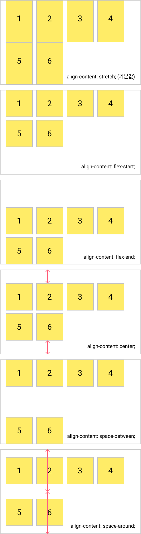아이템이 두 줄 이상일 때 수직축의 정렬 방법을 설정하는 css이다. justify-content를 이용하여 가로 여백을 조정했다면, align-content로는 세로 여백을 조정한다고 생각하면 된다.
