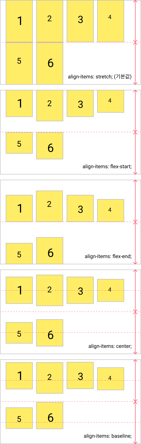 아이템이 두 줄 이상일 때 수직축의 정렬 방법을 설정하는 css이다. justify-content를 이용하여 가로 여백을 조정했다면, align-content로는 세로 여백을 조정한다고 생각하면 된다.