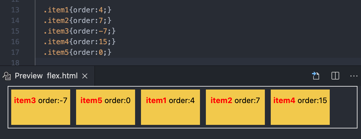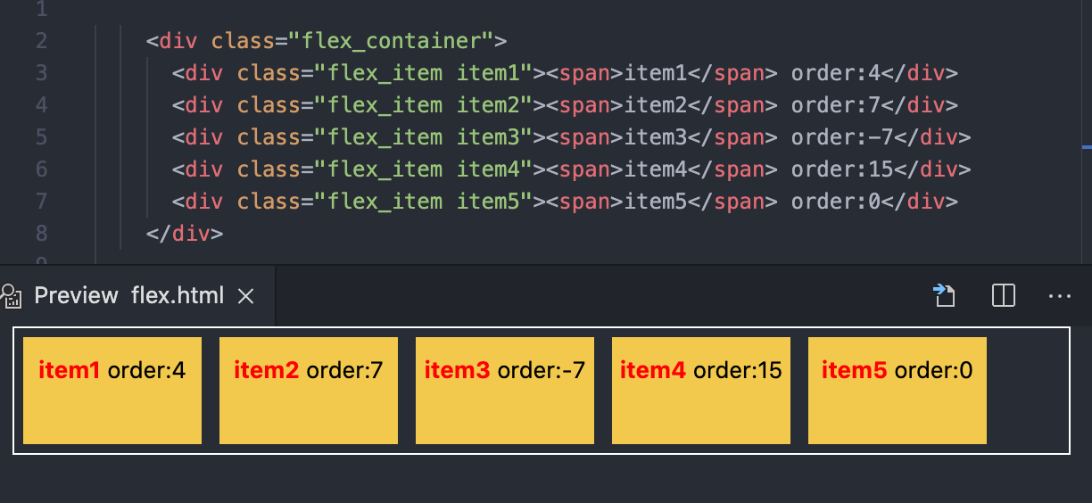 예제를 통해 알아보자. 가장 먼저 order 값을 설정해주지 않은 예제이다. item1 ~ 5까지 순서대로 div가 나열된 것을 확인할 수 있다.