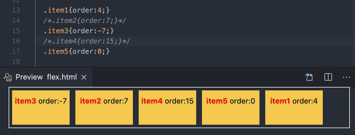 각각의 div에 해당하는 order 값을 주었다. (1부터 차례로 4, 7, -7, 15, 0) 아래와 같이 order 속성값이 작은 것부터 큰 것까지 순서가 바뀌어 나열되었다.