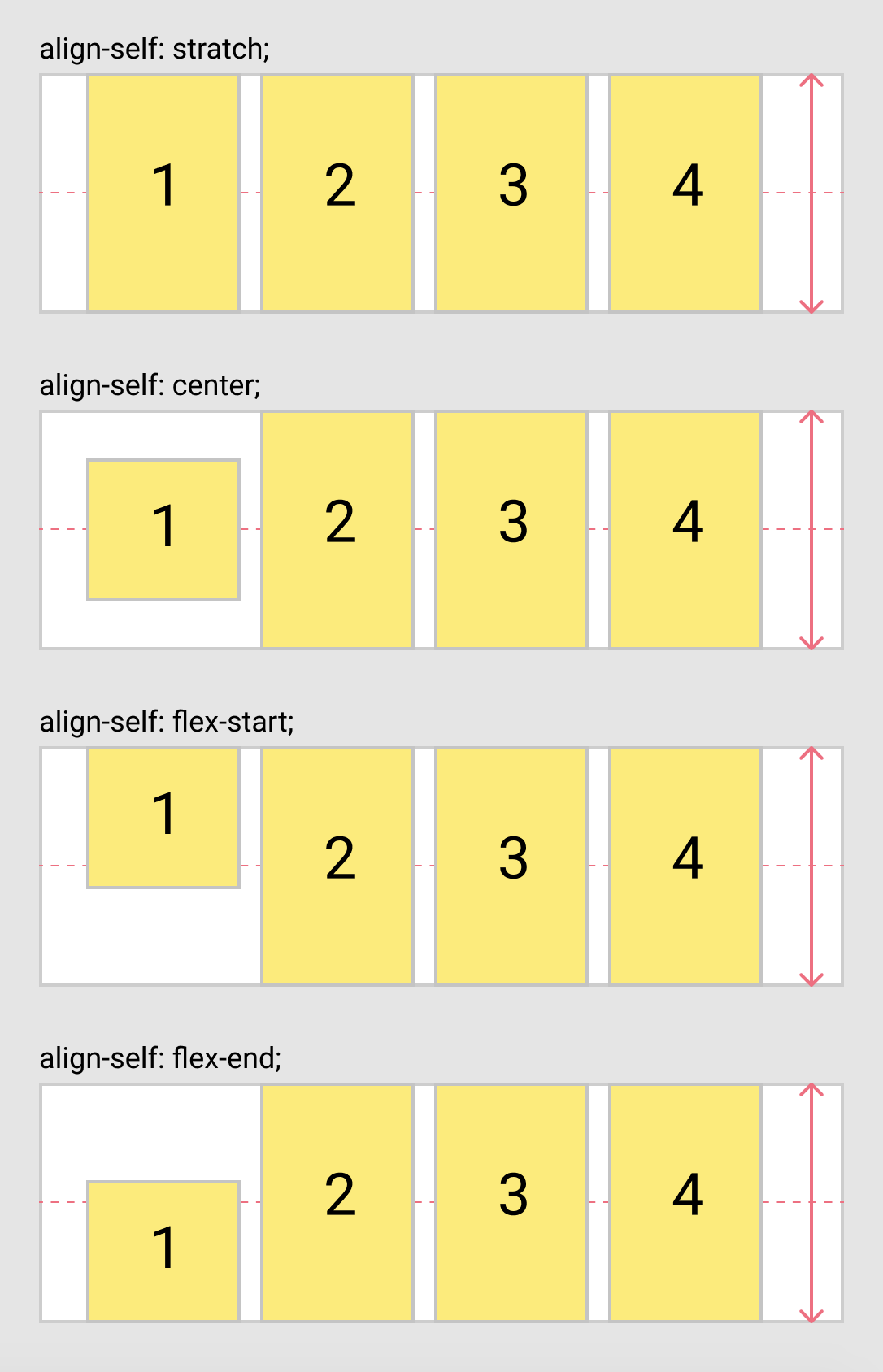 flex container에서 사용된 align-items가 전체 item들의 정렬 조건을 설정하는 것이었다면, flex item에서 사용되는 align-self는 해당 아이템만 정렬 조건을 변경하고 싶을 때 사용한다.