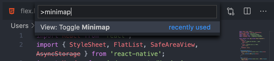 2. 텍스트창에 'minimap' 이라고 입력하면 아래에 'View: Toggle Minimap' 이라는 항목이 표시된다. 선택해주도록 하자!