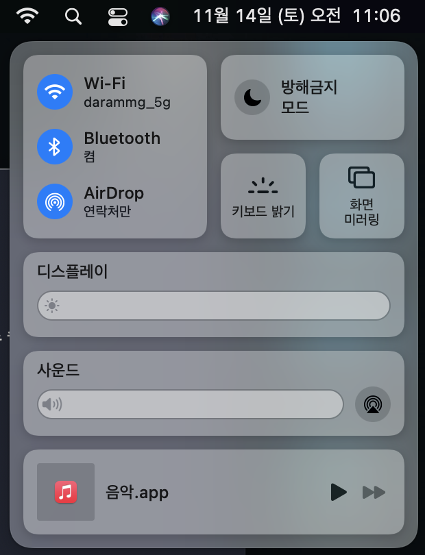 상단 바에 제어 센터가 새로 생겼다. 와이파이 블루투스 등을 제어할 수 있고, 디스플레이 사운드 등도 시스템 환경설정을 거치지 않고 바로 설정 변경이 가능하다. 자주 사용하는 항목이 있다면 메뉴 막대로 드래그해놓고 사용할 수도 있다.