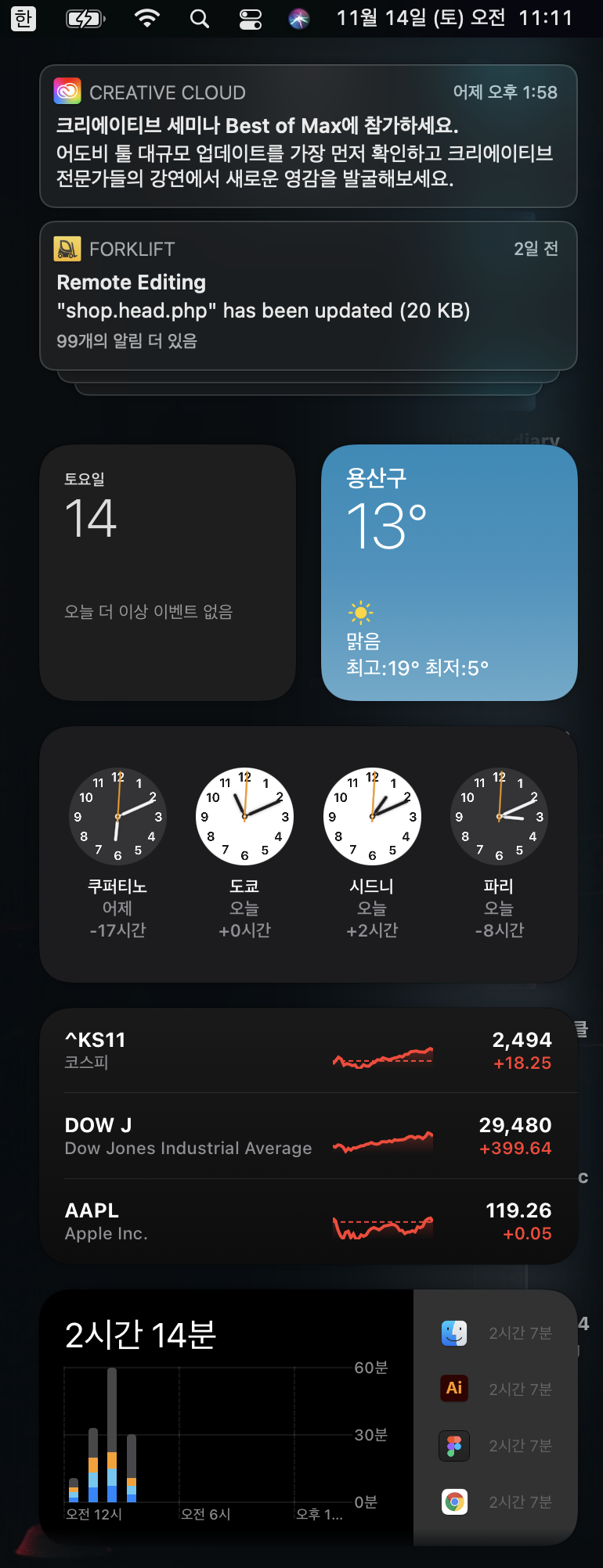 우측 상단에서 날짜 및 시간을 클릭하면 알림 센터를 확인할 수 있다. (여긴 성남인데 왜 용산구 날씨를 알려주는거니?) 위젯 전체 편집을 통해 보여지는 위젯 항목을 입맛에 맞게 세팅할 수 있다.