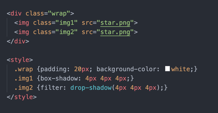 box-shadow 개념을 이해하고 있다면 어렵지 않을 것이다. 아래 예제를 확인하면 box-shadow를 사용했을 때와 filter:drop-shadow를 사용했을 때의 차이점을 금방 알 수 있다.