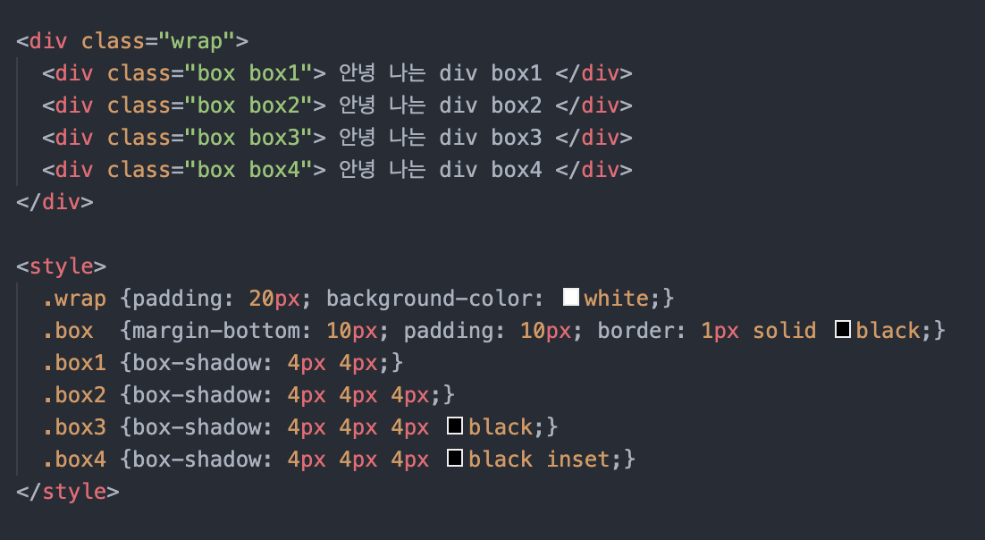 아래 예제로 살펴보면 더 정확하게 이해할 수 있을 것이다. 블러값, 그림자 색상, 내부 그림자 여부는 생략해도 된다.